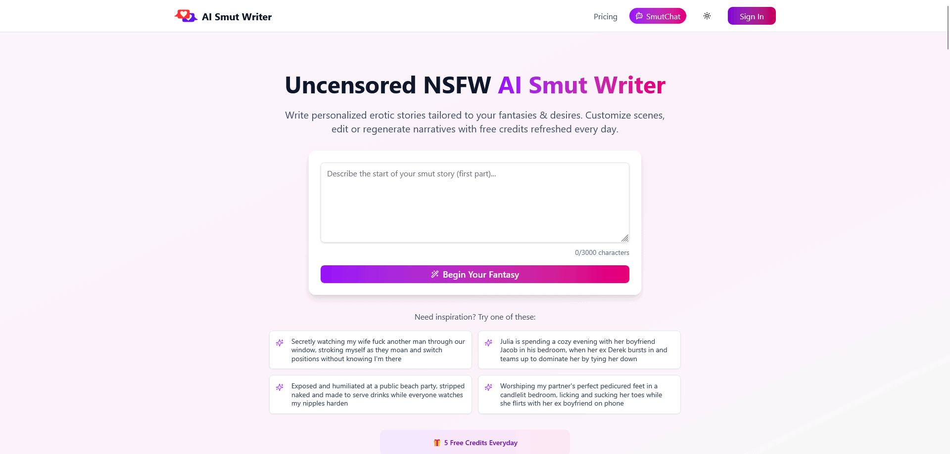 With its commitment to privacy, innovation, and accessibility—starting with free daily credits—AI Smut Writer isn’t just a generator; it’s a gateway to limitless adult storytelling. Join the future of erotic content today and transform your fantasies into reality, one customized scene at a time. Experience the liberation of uncensored creativity and see why it’s voted a top tool for NSFW enthusiasts.