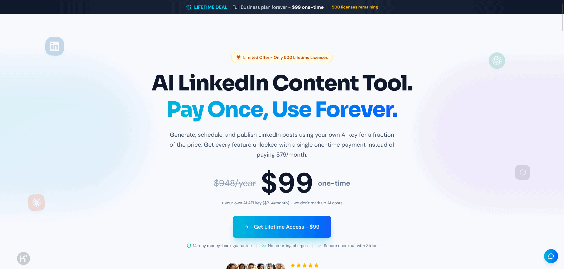 A: You get the full Business plan forever, including all current features and every future update. No recurring charges, no hidden fees. You connect your AI API key once and you have unlimited usage from then on.