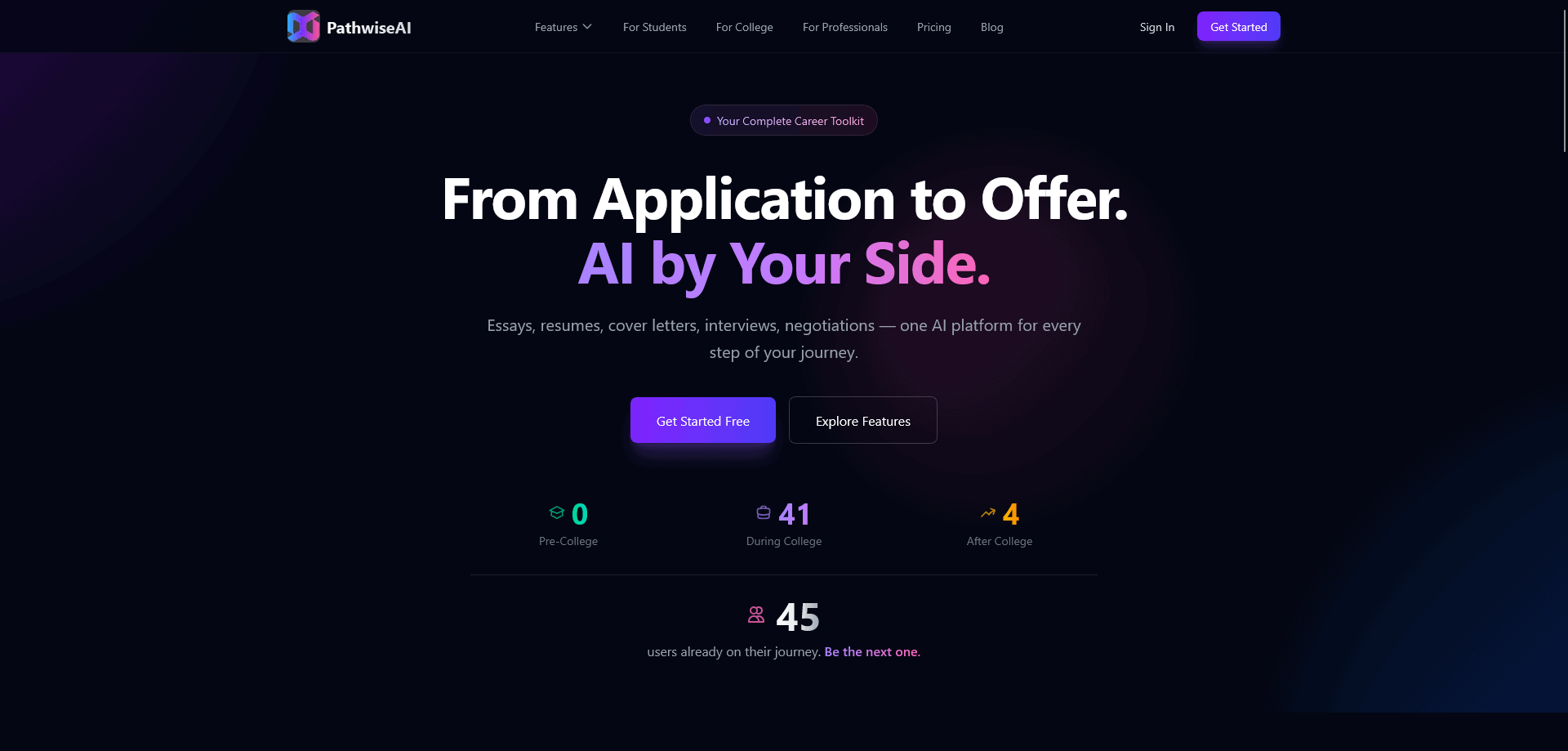 PathwiseAI is the first AI career platform that covers your entire professional journey in one place — from college applications at age 16 to salary negotiation in your 40s. Most career tools solve one problem: a resume builder here, a cover letter tool there, an interview prep app somewhere else. PathwiseAI replaces all of them with 50+ AI-powered tools organized across three life stages: Pre-College, During College, and After College.