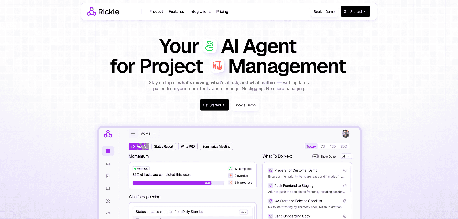 Rickle is built to give modern tech teams the clarity, speed, and confidence they need to deliver projects successfully. From capturing updates in stand-ups to flagging risks in real time, it eliminates the friction of scattered tools and manual follow-ups. With Rickle, you get more than just tracking — you get an AI teammate that joins meetings, generates reports, surfaces answers instantly, and nudges teams so nothing slips through.