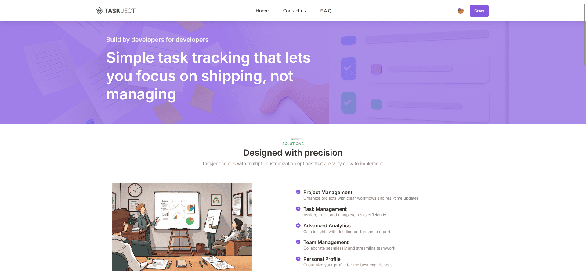 TaskJect is a project management tool designed for small and growing teams that need clarity without complexity. It combines essential features like task management, team collaboration, and performance analytics into a simple, intuitive interface.