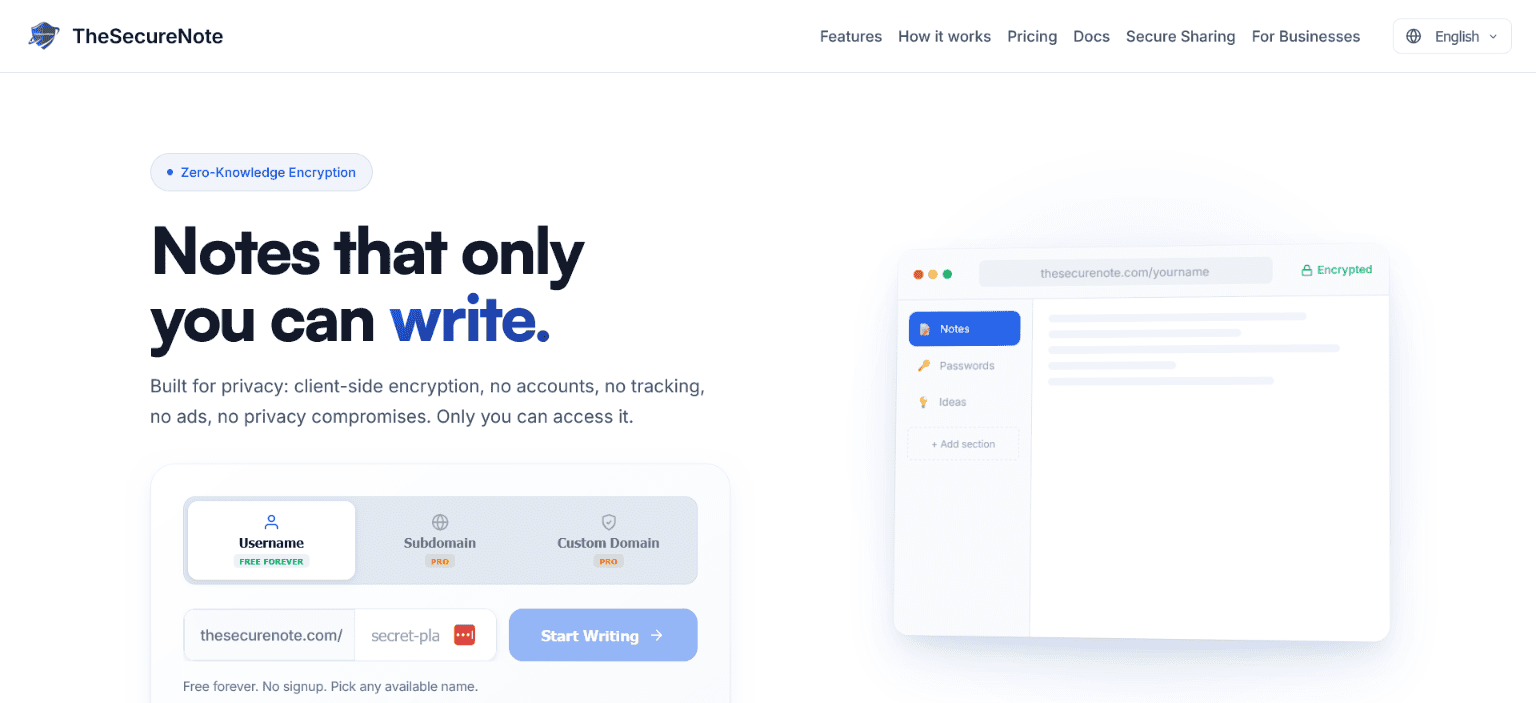There’s no signup flow, no email verification, and no personal data required. Choose a username and start writing immediately. Your notes are available anywhere, while remaining fully encrypted and private.