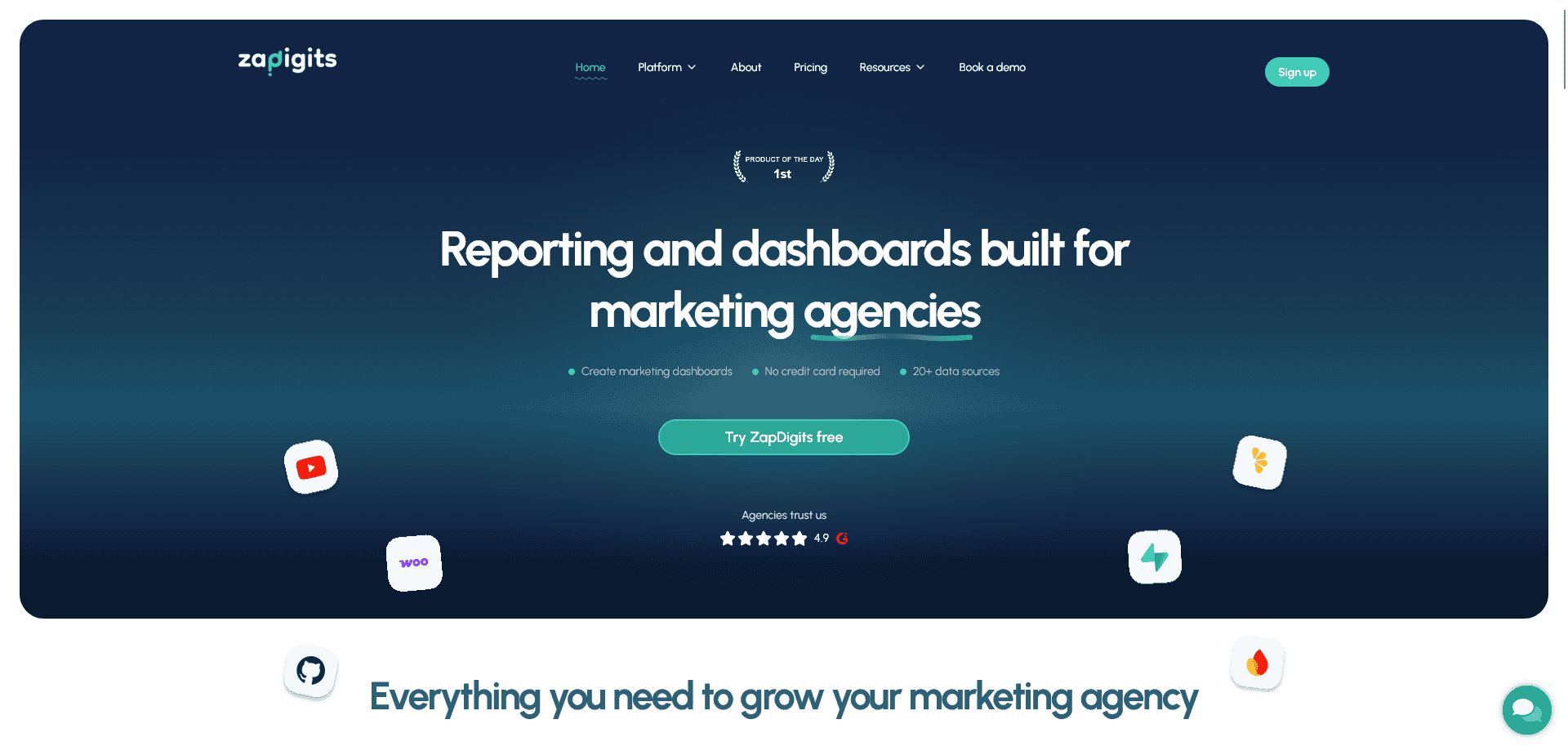 ZapDigits is a platform built for marketing agencies that need a simple way to create white-label dashboards and reports for their clients. You can manage as many clients as you want and build unlimited dashboards, all by connecting 30+ data sources in one place without jumping between tools.